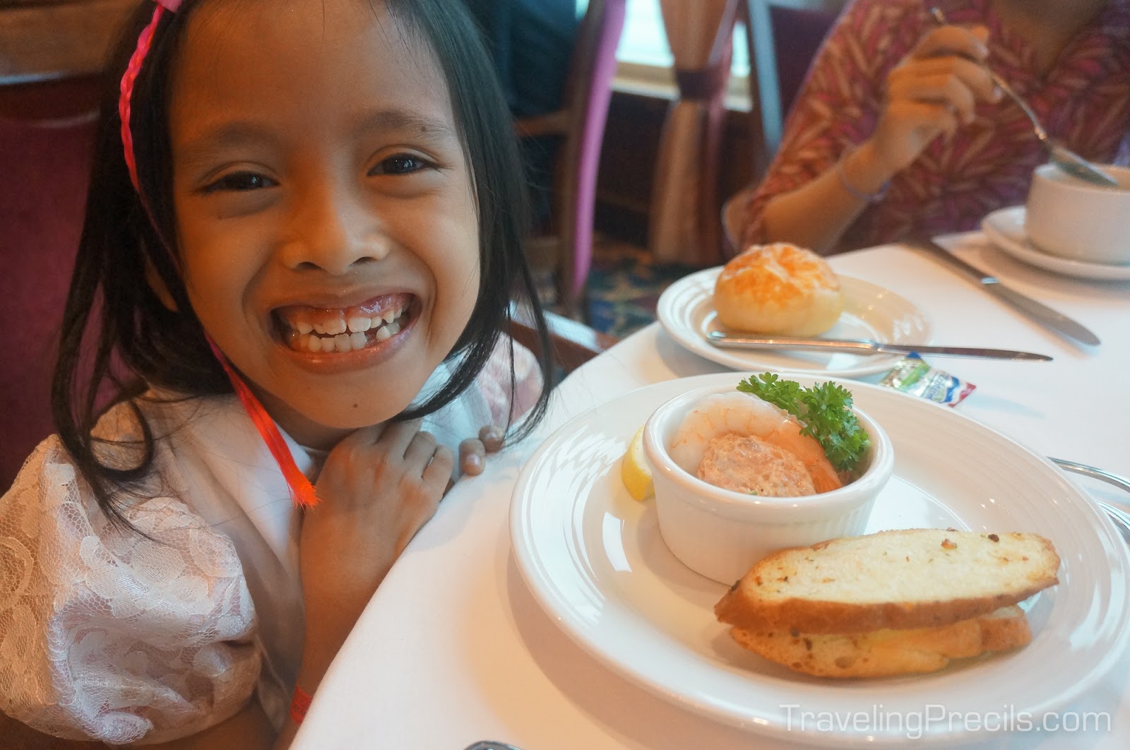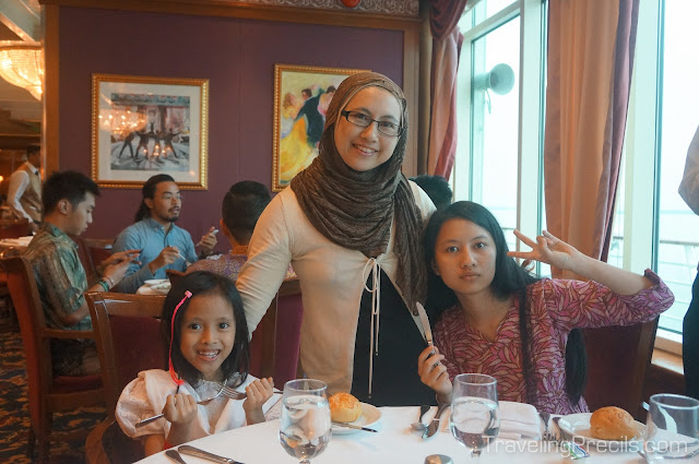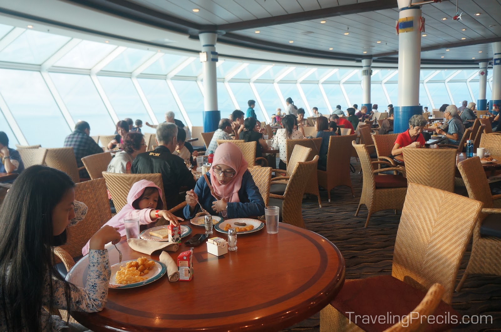 Untuk sarapan prasmanan seperti di hotel, ada restoran Windjammer. Kalau bisa datang pagi dan langit kebetulan cerah, kita bakal sarapan dengan pemandangan sunrise yang cantik. Meski pilihan makanan berlimpah, saya dan anak-anak ternyata nggak bisa mengubah kebiasaan sarapan favorit kami. Saya tetap sarapan dengan buah potong, salad sayuran, dan kopi. Big A sarapan dengan hash brown dan omelet, sementara Little A dengan roti panggang dioles selai. Alhamdulillah ada susu full cream untuk melengkapi sarapan duo precils.