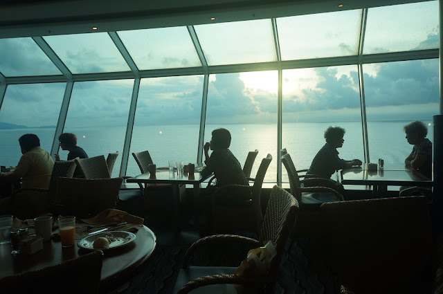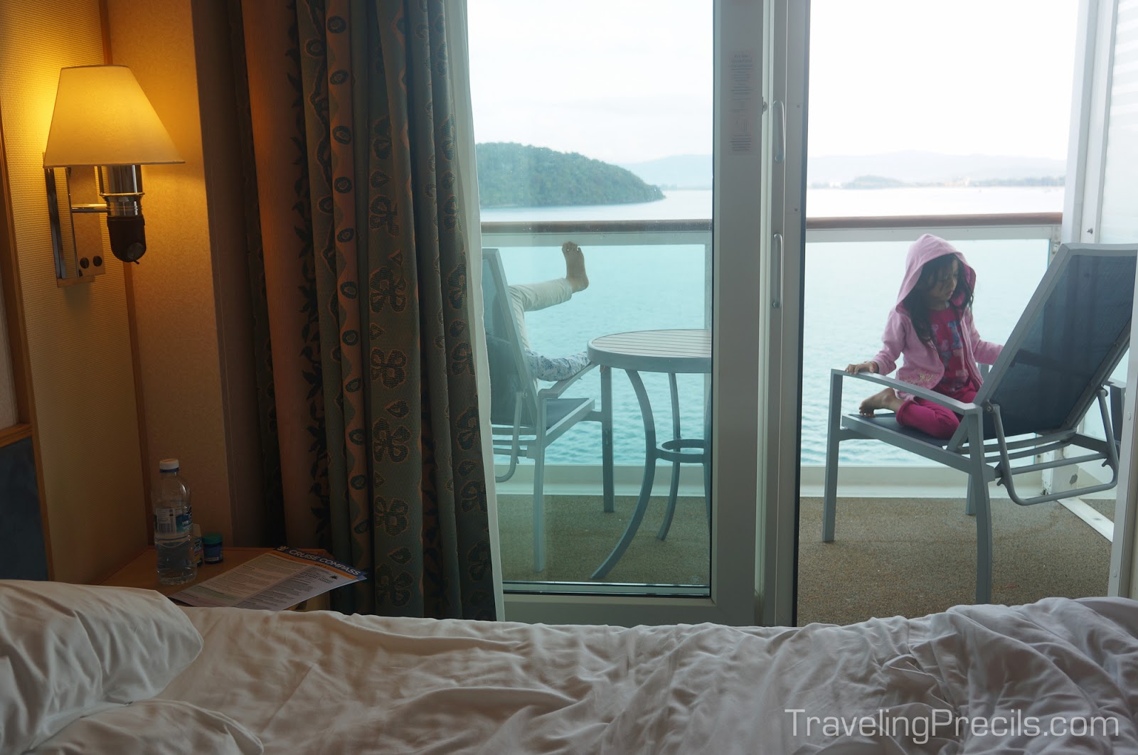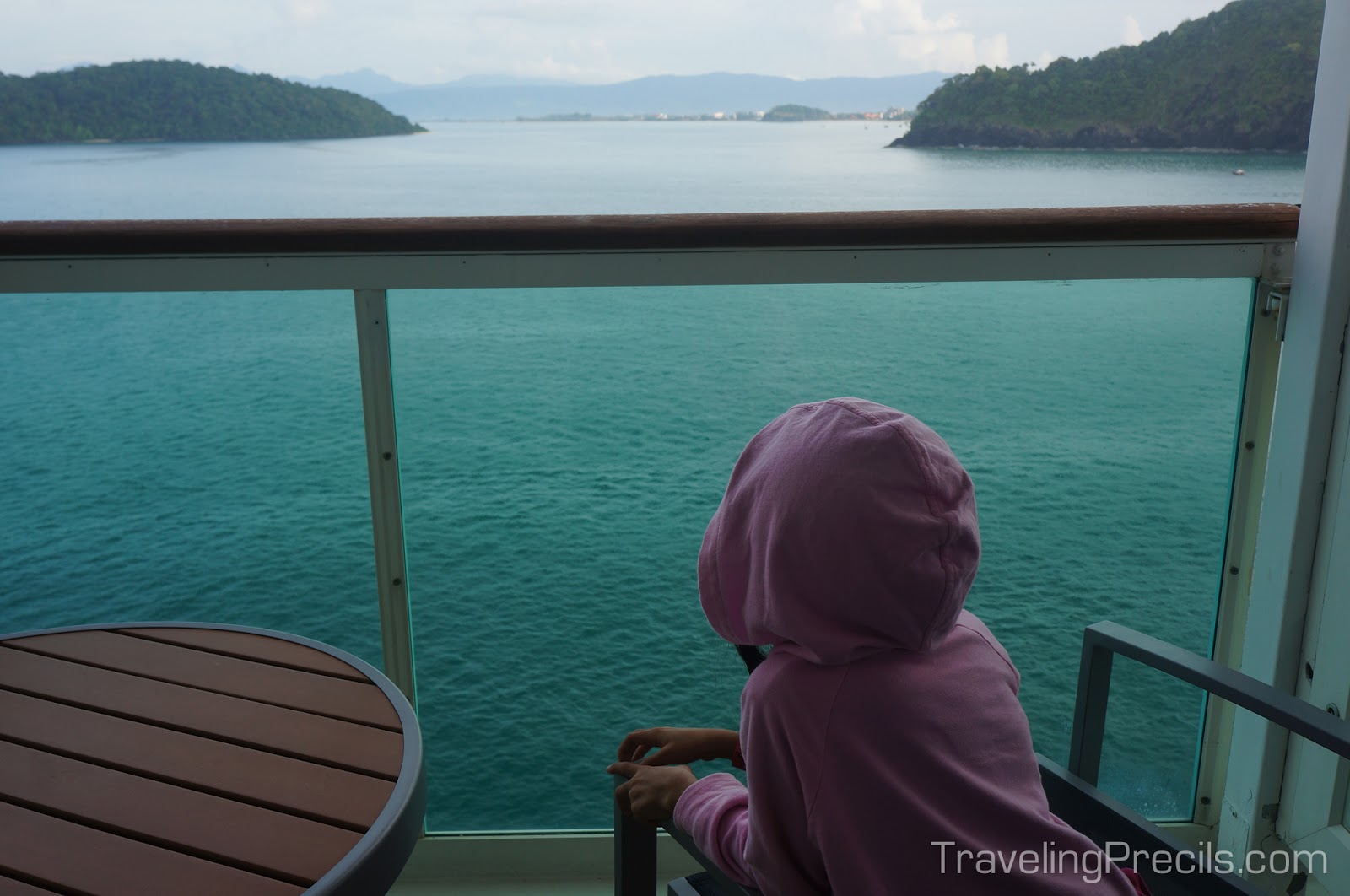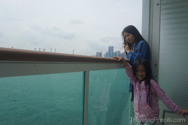 Apa yang paling asyik di kamar kami? Jawabnya adalah balkon! Dari balkon, kita bisa melihat kesibukan di pelabuhan, laut lepas, dan pemandangan pulau atau kota ketika kapal akan berlabuh. Tiap pagi bisa melihat matahari terbit, dan sorenya bisa melihat matahari terbenam. Kadang kami juga dihadiahi pelangi yang cantik setelah hujan usai. Kalau menginap di hotel, kami hanya bisa melihat satu view yang sama. Tapi kalau ikut cruise, pemandangannya bisa beda-beda tiap hari.
