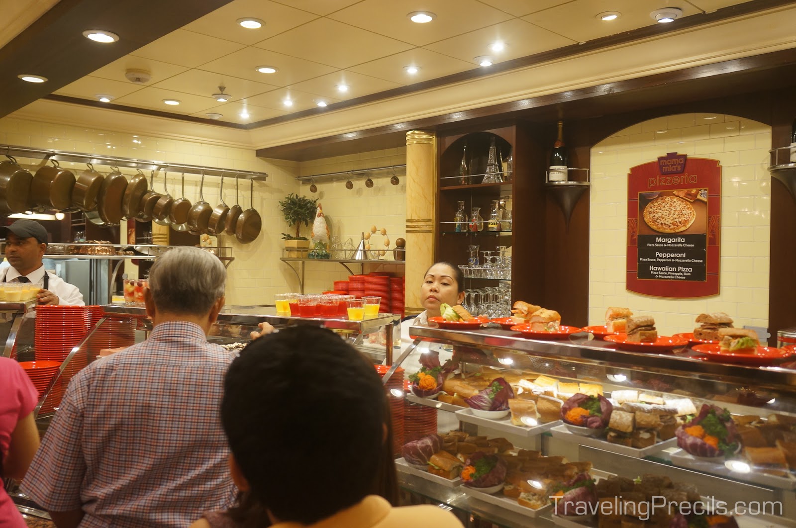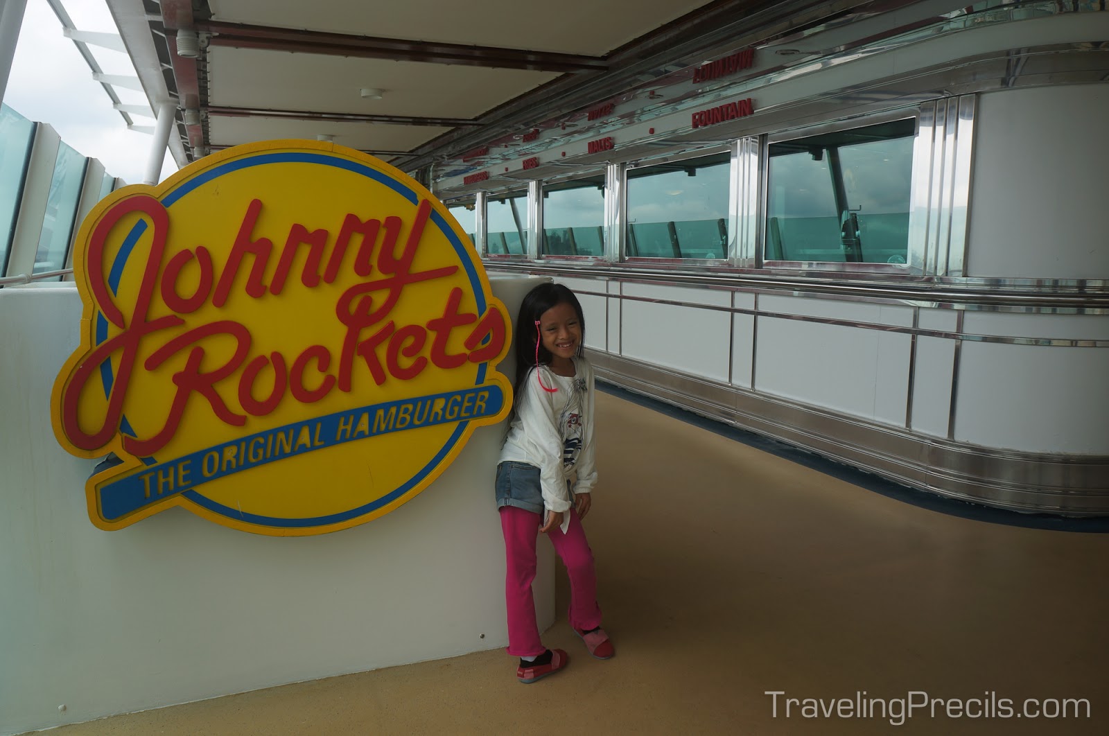 Untuk makan siang, kita bisa tetap makan di Windjammer. Menu untuk makan siang tentu berbeda dengan menu sarapan. Atau kalau bosen prasmanan, bisa mencoba beberapa restoran yang berbayar, seperti Johnny Rockets yang menyajikan hamburger atau Giovannis’ Table yang merupakan restoran Italia.