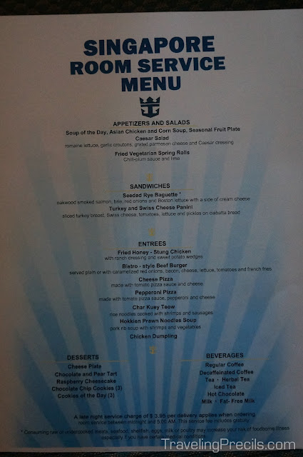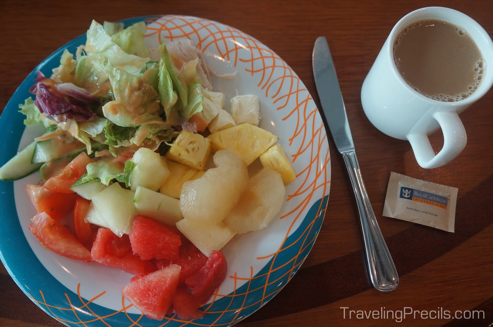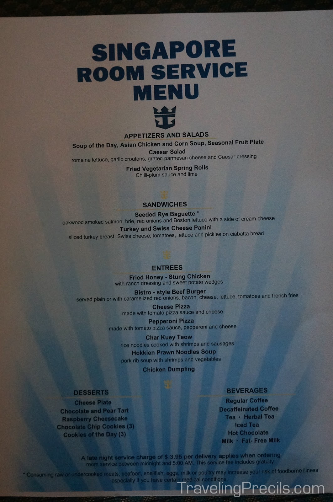 Makanan di kapal pesiar Royal Caribbean melimpah ruah. Dijamin tidak akan kelaparan di sini. Kalau memilih leyeh-leyeh di kamar pun, kita bisa pesan room servis, gratis! Biaya hanya dikenakan untuk pemesanan tengah malam.