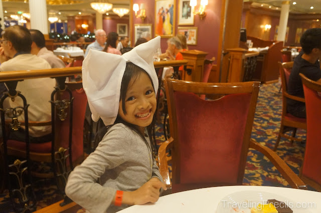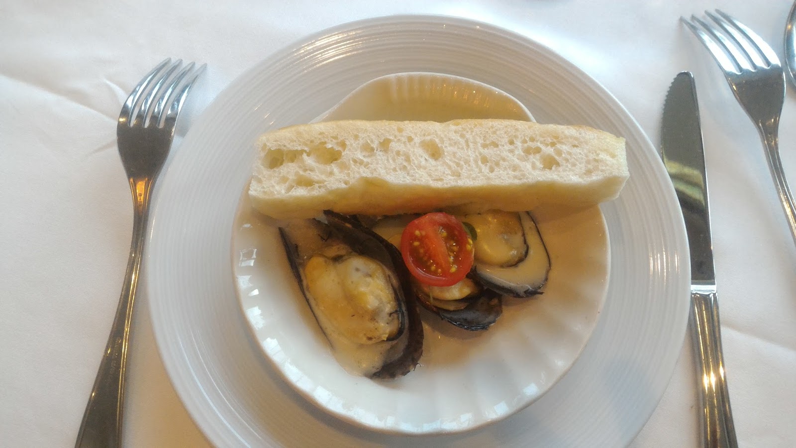 Pengalaman makan yang tak terlupakan di kapal pesiar adalah fine dining setiap malam. Setiap penumpang kapal sudah dialokasikan meja tertentu untuk makan malam. Jadwal makan malam kami setiap jam 5.30 sore di restoran Top Hat and Tails. Menunya 3 course, mulai dari hidangan pembuka, hidangan utama, dan hidangan penutup. Setiap hari menunya ganti-ganti.