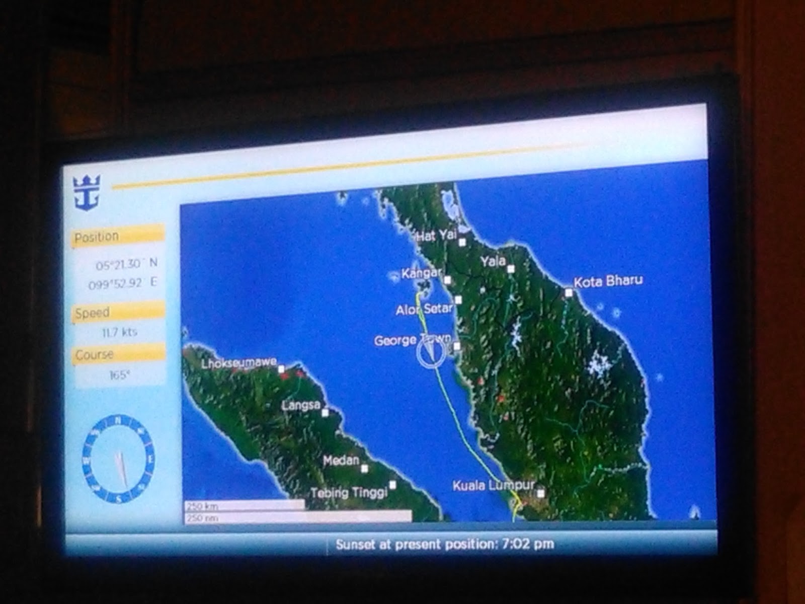 Rute kapal kami yang berlayar selama 4 malam adalah Singapura – Port Klang (KL) – Langkawi – Singapura. Di hari pertama kami bisa menikmati pemandangan pelabuhan Singapura yang sibuk. Di hari kedua, kami disuguhi pemandangan Port Klang Malaysia yang relatif lebih sepi dan tenang. Hari ketiga pemandangannya super sekali, gugusan pulau di Langkawi.