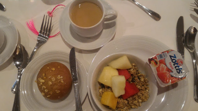 Selain Windjammer, kita bisa sarapan di restoran ala carte seperti di Rhapsody in Blue atau Top Hat and Tails. Di sini kita harus antre untuk mendapatkan tempat duduk, dan menu sarapannya pun akan disiapkan pelayan. Kita bisa minta dibuatkan bagel salmon atau french toast. Tapi di sini pun saya tetap sarapan dengan granola, buah, dan yoghurt. Yang penting kopinya enak!