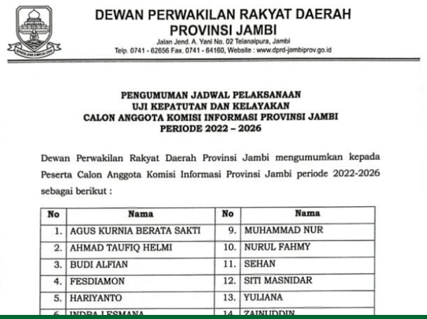 Dewan Perwakilan Rakyat Daerah (DPRD) Provinsi Jambi melalui Komisi 1 mengumumkan jadwal pelaksanaan tes kelayakan dan kepatutan (fit and proper test) kepada calon anggota Komisi Informasi Publik (KIP) Provinsi Jambi, periode 2022-2026.