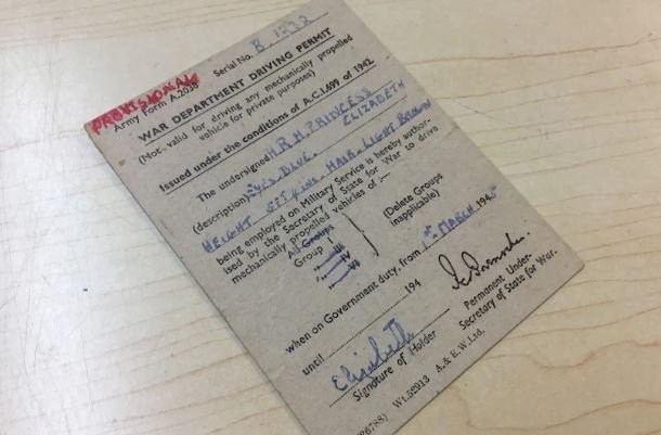 Surat izin mengemudi militer sementara yang bertuliskan tanggal 1 Maret 1945 ini diberikan kepada Ratu Elizabeth sebelum naik takhta, tepatnya ketika masih menjadi montir di tahun terakhir Perang Dunia II.