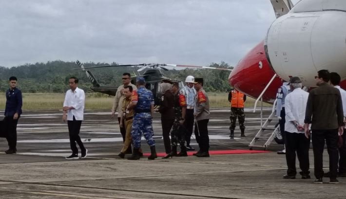 Presiden Jokowi mendarat di Bandara Muara Bungo, sekira pukul 09.55 WIB, Rabu (03/04/2024) pagi.