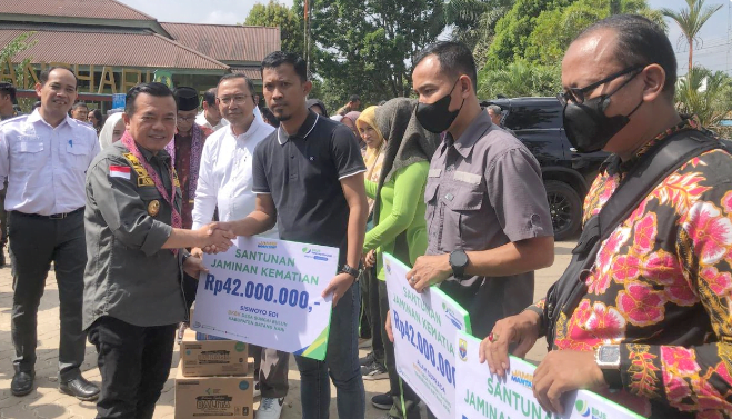 Penyerahan santunan kematian tersebut juga bertepatan dengan kegiatan penyaluran Dumsake Pendidikan yang berlangsung di lapangan SMK Negeri 1 Batanghari.